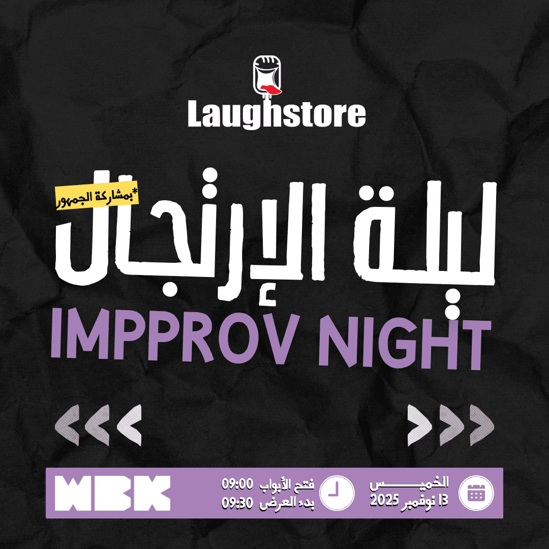 الخميس 13\11 | الساعة 09:00 مساءً .. ليلة الارتجال من لاف ستور .. تجربة كوميدية ما تشبه أي عرض ثاني! .. ضحك ولعب ومتعة بكل ابداع وعفوية، وبمشاركة الجمهور .. احجز الآن وكن جزء من لحظات لا تُنسى!