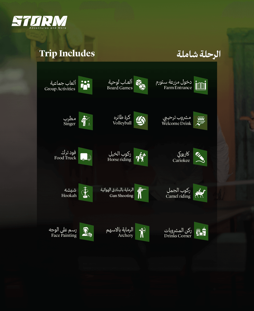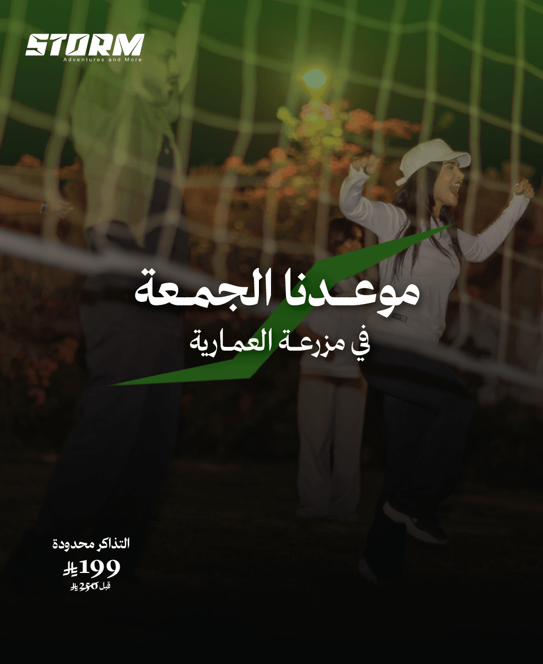 استعد لأقوى صيف في العمارية! هل أنت جاهز ليوم مليء بالمغامرة، والضحك، والموسيقى؟ 🌞 مزرعة العمارية ستورم تفتح أبوابها لك ولأصحابك لتعيشوا تجربة ترفيهية لا تُنسى وسط أجواء الطبيعة والإثارة! 🎶🌿 أنشطة تفاعلية، وألعاب جماعية، وأجواء حماسية تخليك تعيش لحظات ممتعة وتشاركها مع وجوه جديدة وأرواح مرِحة! تغمرُك بالحماس والانتعاش وتخلي يومك استثنائي بكل تفاصيل!