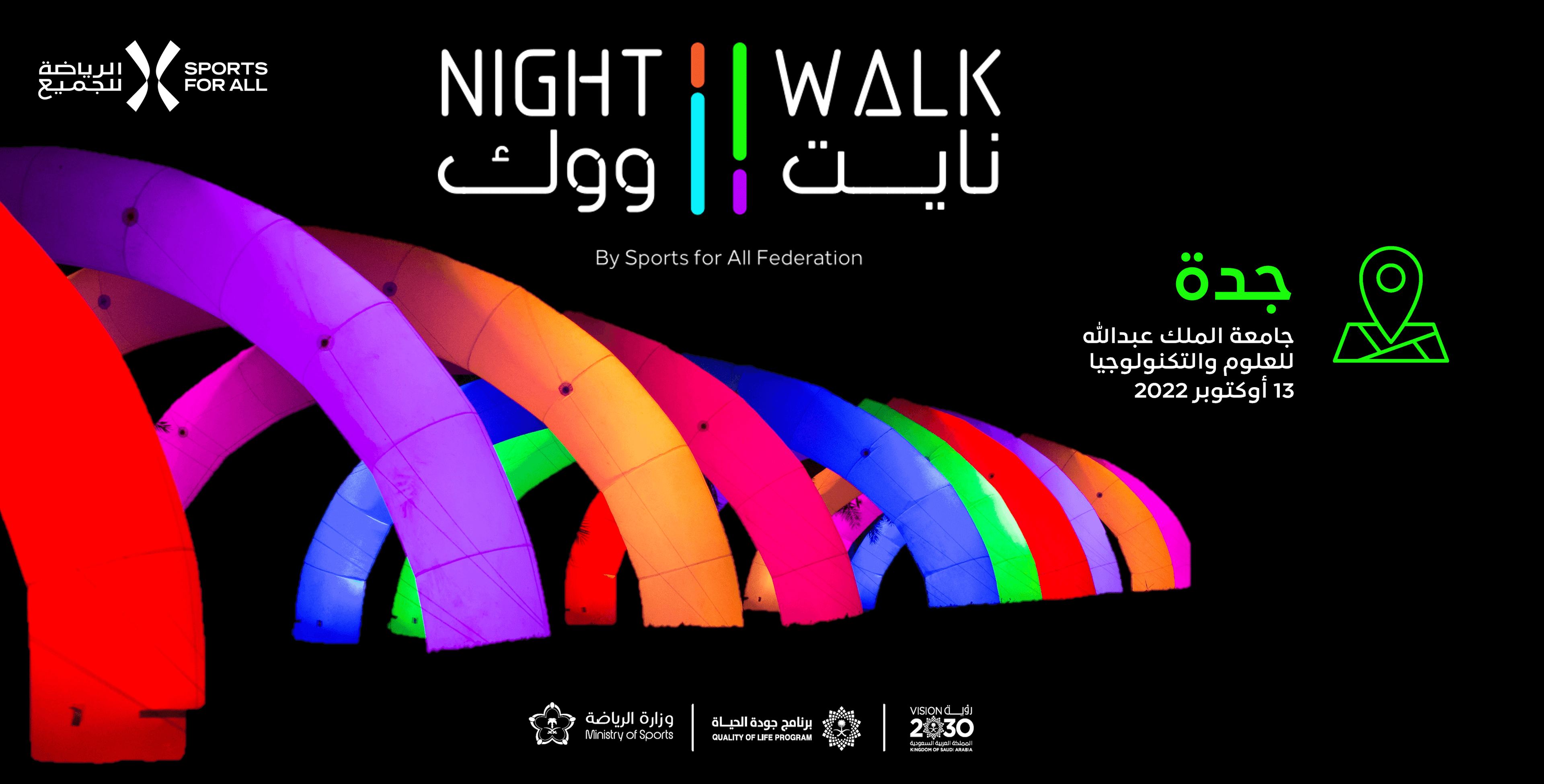 الاتحاد السعودي للرياضة للجميع يقدم لكم تجربة للمشي مميزة مليئة بالأضواء النيون والموسيقى الحماسية في أكثر من منطقة من مناطق المملكة.