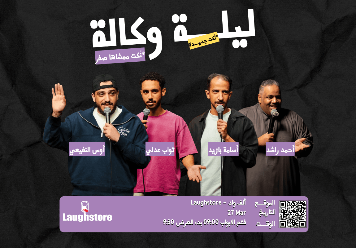 Comedy Nights by Laughstore .. live comedy shows featuring talented comedians, laughter, and great energy! .. Book your ticket now and get ready for a weekend full of good vibes and fun!